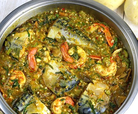Delicious okra soup with mackerel fish and spinach. Healthy choice.